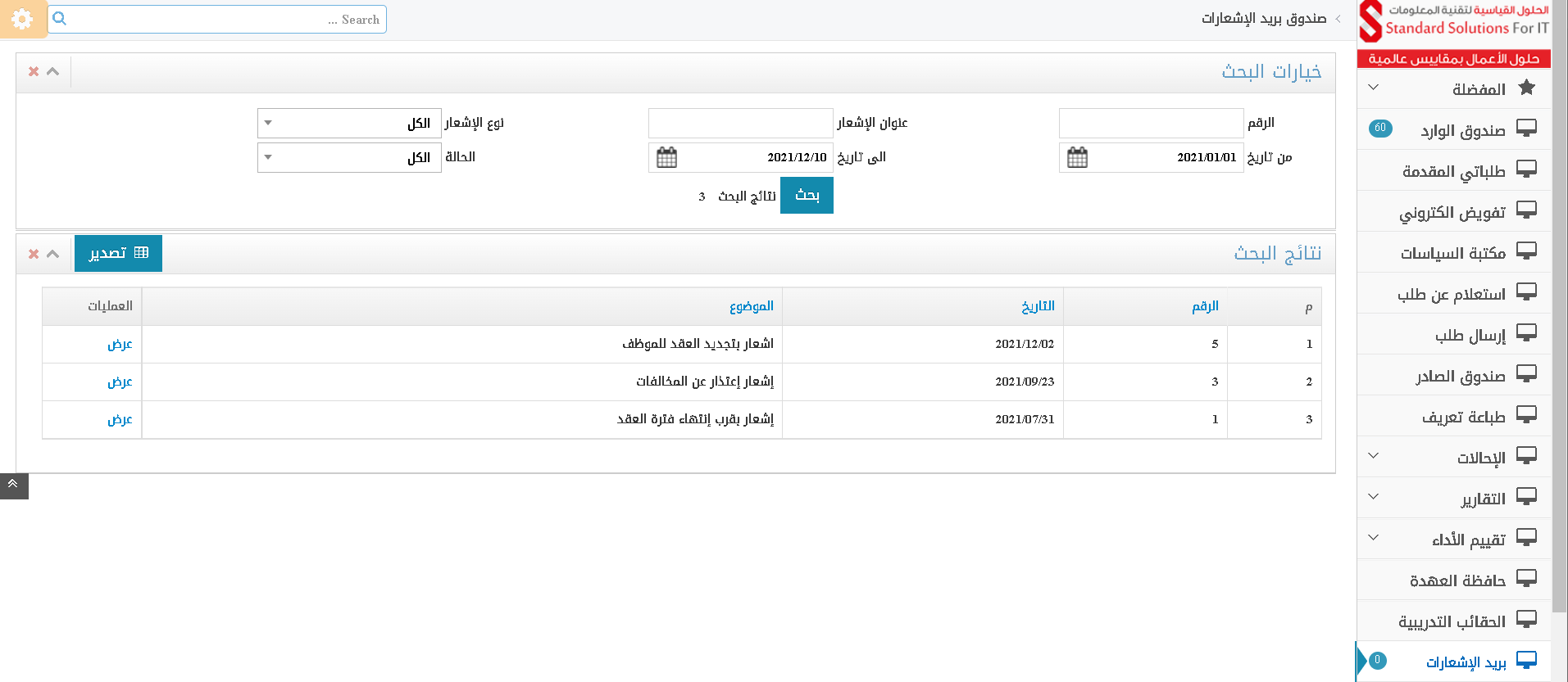 وكما هو واضح في شاشة بريد الإشعارات ادناه، يتم تحديد معايير البحث ومن ثم الضغط على زر