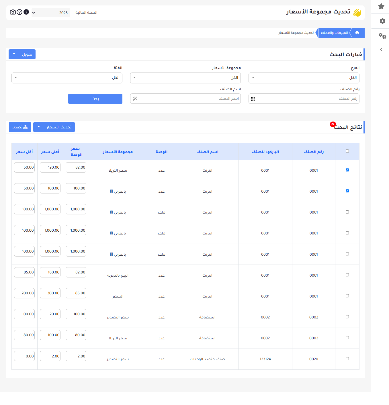 يتيح تحديث مجموعة الأسعار عرض وتحديث مجموعة الاسعار المسجلة بالنظام حسب معايير الفلترة المحددة وصلاحيات المستخدمين على الفروع والمخازن والعملاء.
